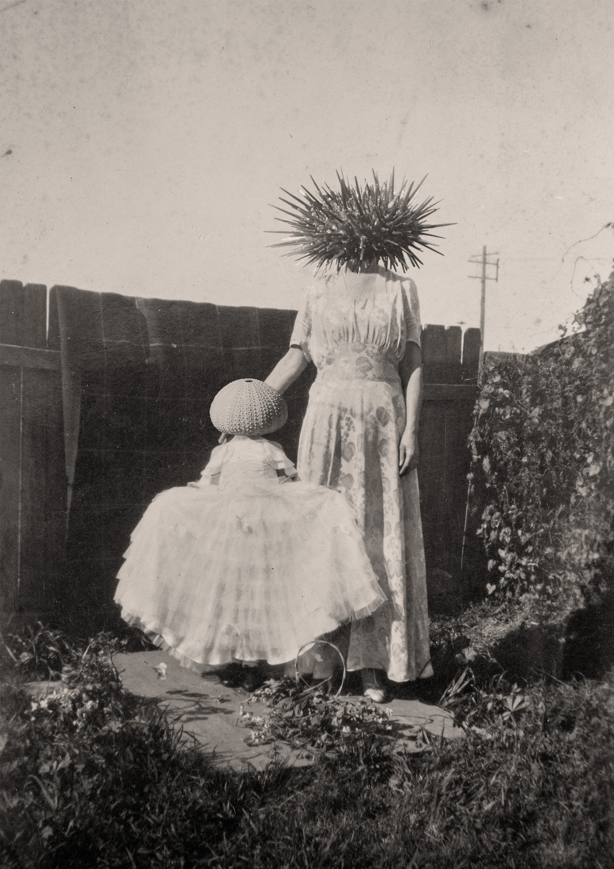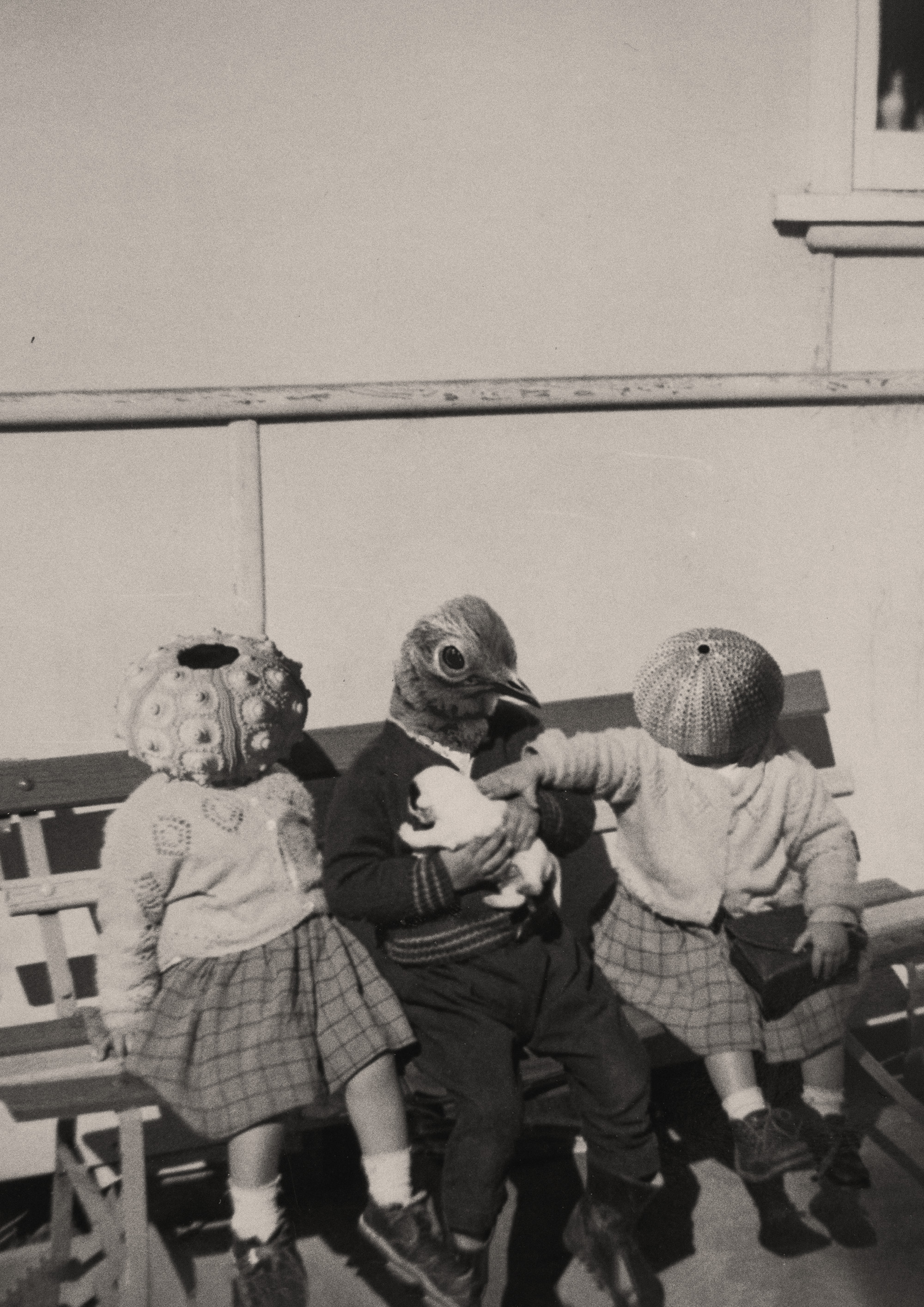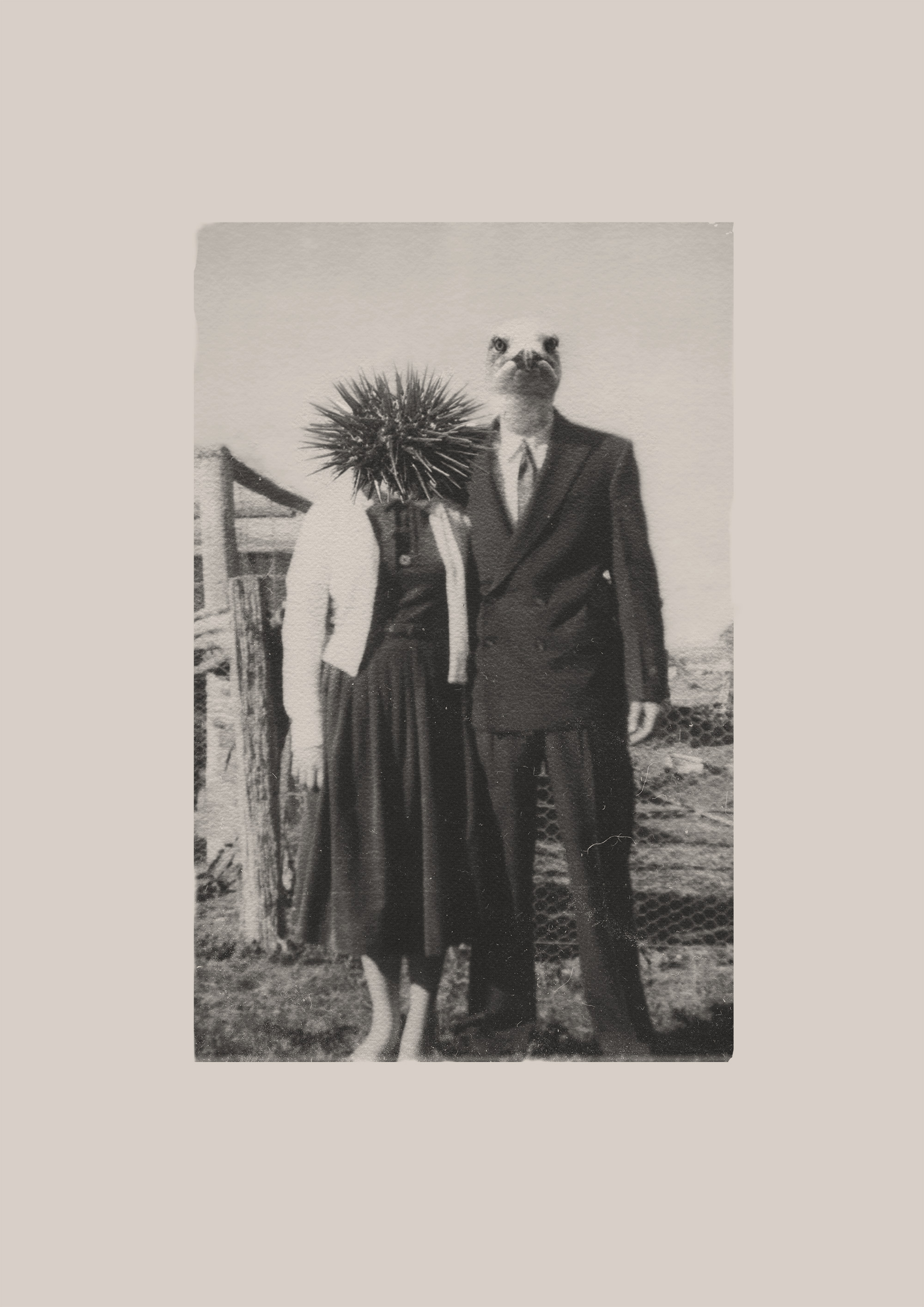 This series emerged from an observation of gender behaviours and they have evolved similarly to behaviours in the animal kingdom. Seagulls are brash and predatory toward urchins, which have developed brittle, defensive traits, while lyrebirds listen to the cries of the seagulls and imitate their actions. These Australian fauna are digitally superimposed onto old family photographs, with each assigned to men, women, boys, and girls to represent different gender roles.
