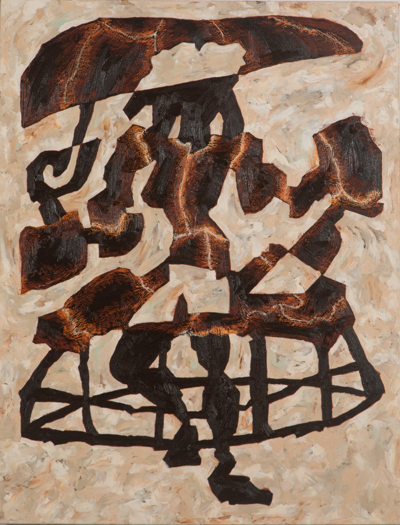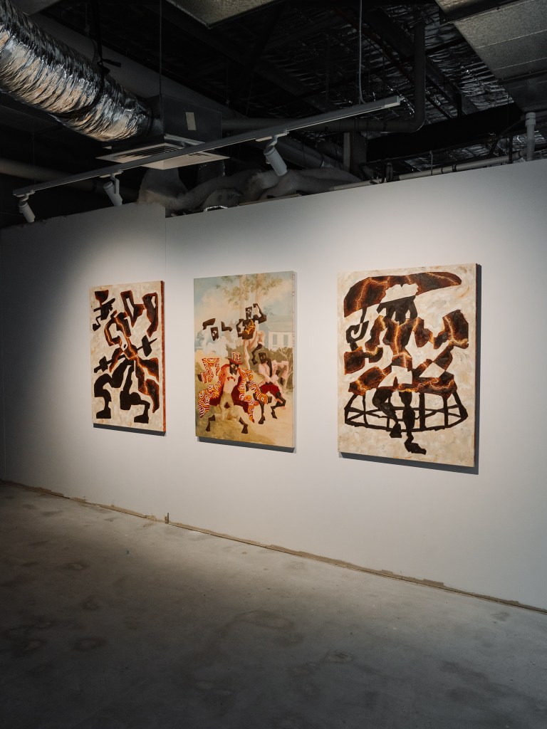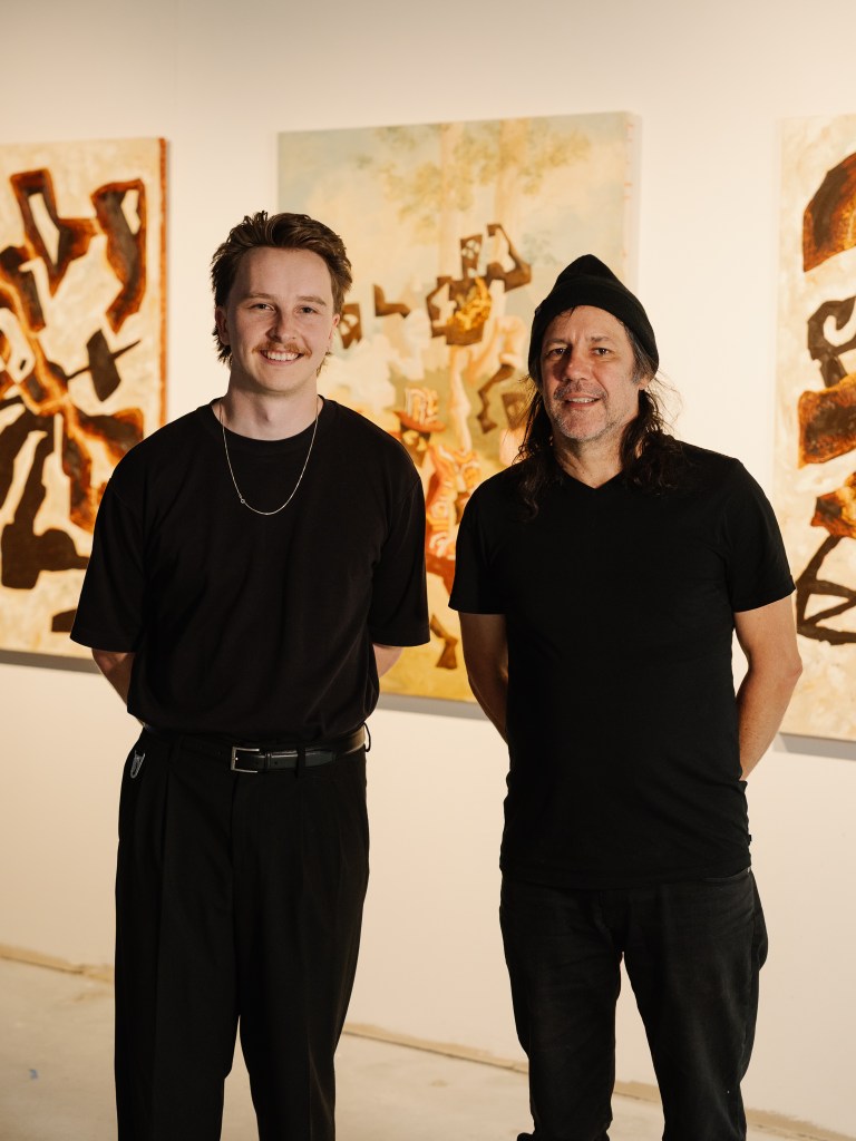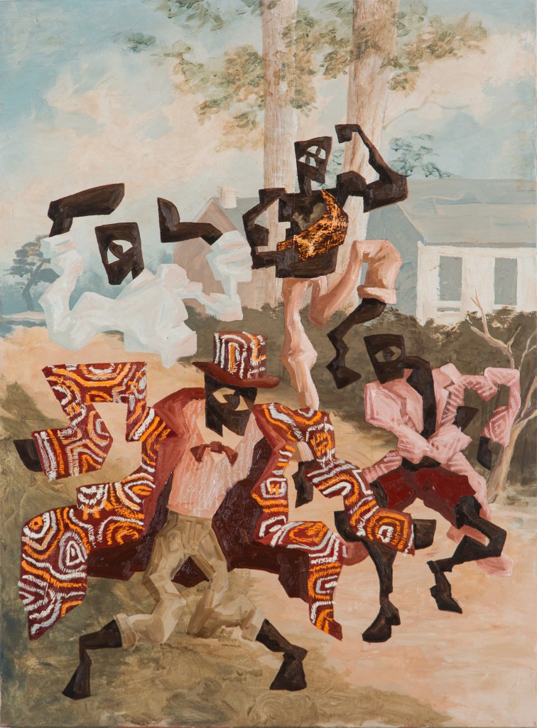 Djagats is a large-scale oil painting series that reinterprets Samuel Thomas Gill’s colonial watercolours The Newly Arrived (1840-1872) and Native Dignity (1840-1872). These original works depicted First Nations people from a Eurocentric perspective that reinforced the colonial narrative. In contrast, Djagats reimagines these portrayals to create a more empowering representation, addressing the history of clothing in colonial Australia and its use as a tool for assimilation. In this series, these garments are reclaimed and adorned with traditional patterns and possum fur, symbolising resilience, cultural pride, and identity. Inspired by the ‘sapeurs’ of Congo, a group known for transforming European fashion into a vibrant symbol of resistance and cultural expression, Djagats similarly redefines colonial attire as a powerful expression of Indigenous agency. The paintings subvert hyper-masculine tropes stained throughout colonising efforts, presenting an alternative that emphasises strength through joy and gentleness, rather than aggression or dominance.